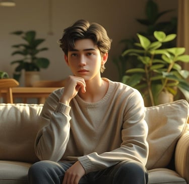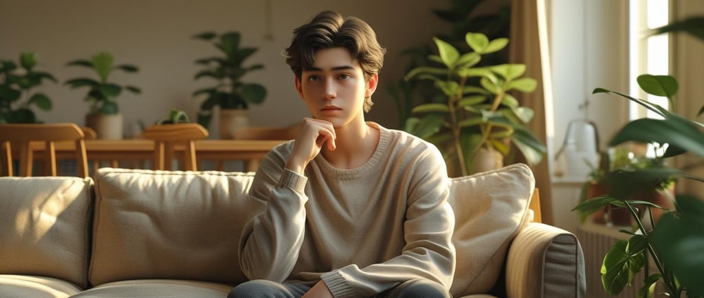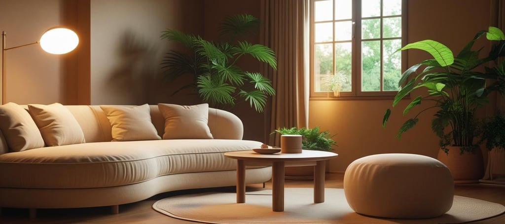 Ruang Tamu → fokus pada sofa nyaman, meja kayu, dan pencahayaan lampu lantai.